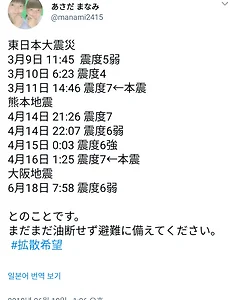 murmur1089 제.발. わたしの先輩で、ストレスで片耳難聴になって、1年近く経った山手線の中でふぅ っと音がサラウンドになって難聴が消えた人がいます。 頑張るあなたに、どうぞすてきな星が降りますように。 나의 선배 중에 스트레스로 한 쪽 귀 난청이 되어 1년 가까이 지났는데 야마노테선의 가운데서 후웃... 하고 소리가 서라운드 되더니 난청이 사라진 사람이 있습니다. 노력하는 당신에게 부디 멋진 별이 내려오기를. 어제 이 글 보고 제.발. 이라고 생각했는데 럽파 보고 또 다시 봐도 제.발. 이라는 생각 밖에 안 드네.... 진짜 제.발. 2018. 6. 20. 쟈니스 "전원 참가 필수"의 컴플라이언스 강습 6/20(水) 5:01配信 ジャニーズ「全員参加必須」のコンプライアンス講習 쟈니스 "전원 참가 필수"의 컴플라이언스 강습 元TOKIO山口達也(46)が女子高生への強制わいせつ容疑で書類送検され、先月ジャニーズ事務所を契約解除となって以降、ジャニーズの所属タレントが「全員参加必須」のコンプライアンス講習を受けていることが19日、分かった。 전 TOKIO 야마구치 타츠야(46)가 여고생 강제 추행 혐의로 불구속 입건됐으며 지난 달 쟈니즈 사무소를 계약 해제가 된 이후, 쟈니스 소속 탤런트가 "전원 참가 필수"의 컴플라이언스 강습을 받고 있는 것으로 19일 알려졌다. 複数の関係者によると、先月中旬と今月中旬、事務所内で講習が開催され、来月も行われる予定だという。それぞれタレント20~30人以上が受講した。若手だけではなく、TOKIOのメンバーらベテラン.. 2018. 6. 20. 과거 지진 강도 변화 추이 東日本大震災 3月9日 11:45 震度5弱 3月10日 6:23 震度4 3月11日 14:46 震度7←本震 熊本地震 4月14日 21:26 震度7 4月14日 22:07 震度6弱 4月15日 0:03 震度6強 4月16日 1:25 震度7←本震 大阪地震 6月18日 7:58 震度6弱 とのことです。 まだまだ油断せず避難に備えてください。 #拡散希望 ■ 2011 동 일본 대지진 3월 9일 11:45진도 5약 3월 10일 6:23진도 4 3월 11일 14:46진도 7← 본진 ■ 2016 쿠마모토 지진 4월 14일 21:26진도 7 4월 14일 22:07진도 6약 4월 15일 0:03진도 6강 4월 16일 1:25진도 7← 본진 ■ 2018 오사카 지진 6월 18일 7:58진도 6약 라는 것입니다. 아직 방심하지 않고 피난에 준비.. 2018. 6. 18. 6/19 이후 칸사이 지방 일기 예보 近畿地方の方々、ご無事でしょうか… 今後の雨の降り方も心配です。 あす(火)午後は次第に雨。 20日(水)は警報級の大雨の可能性があります。 今週は平野予報士にかわり ニュース7(月〜金)の気象情報も担当しますのでそちらでもお伝えすると思います。 https://t.co/Z8Ok0qiALN 킨키 지방 분들,, 괜찮으신지요?.. 향후의 비도 걱정입니다. 내일(화) 오후는 점점 비. 20일(수)는 경보급의 폭우의 가능성이 있습니다. 비는 오지 말아라 제발.....ㅜ 2018. 6. 18. 이전 1 ··· 8 9 10 11 12 13 14 ··· 273 다음