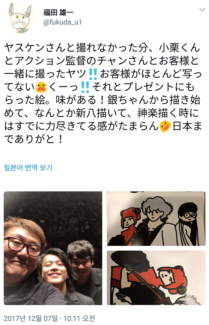 야스 켄상과 찍을 수 없었던 만큼 오구리군과 액션 감독의 장씨와 관객과 함께 찍은 것 ‼ 관객이 거의 안나왔어 칫!! 그리고 선물로 받은 그림. 맛이 있네! 긴짱부터 그리기 시작해서 그럭저럭 신파치 그리고 카구라 그릴 때는 이미 힘이 다한 느낌이 참을 수 없네. 일본까지 고마워!