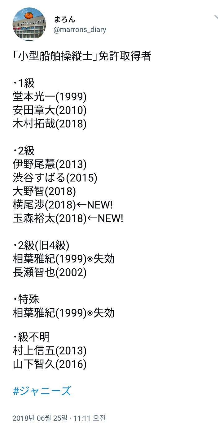 [도모토 코이치] 쟈니즈「소형 선박 조종사 면허」취득자