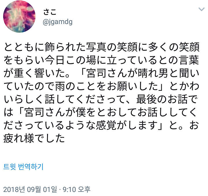 쯔요시상은 오늘 지난해 돌아가신 헤이안 신궁의 사제장께서 잠들고 있는 곳에 참배하러 갔대요. 작년 라이브를 못 해서 사제장님과 마지막으로 만날 수 없던 것이 굉장히 아쉬움이었다 듯 쯔요시씨의 이야기에 가슴이 찡해왔네.'(~ω`c)'.