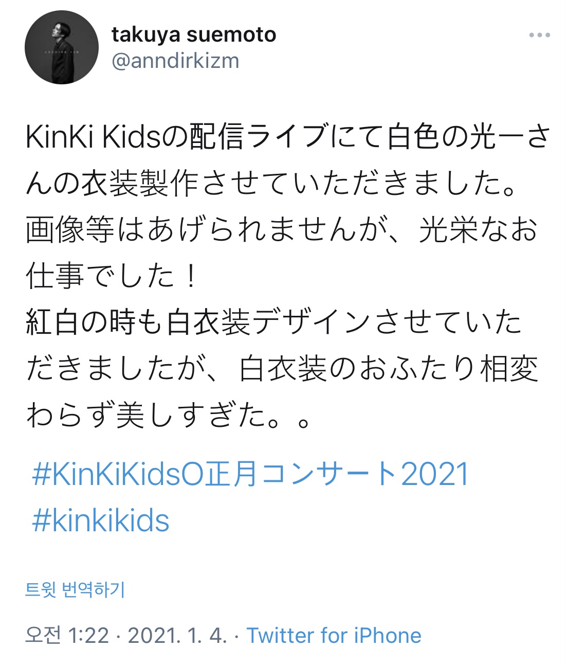 KinKi Kids의 배신 라이브에서 백색의 코이치씨의 의상을 제작하였습니다.