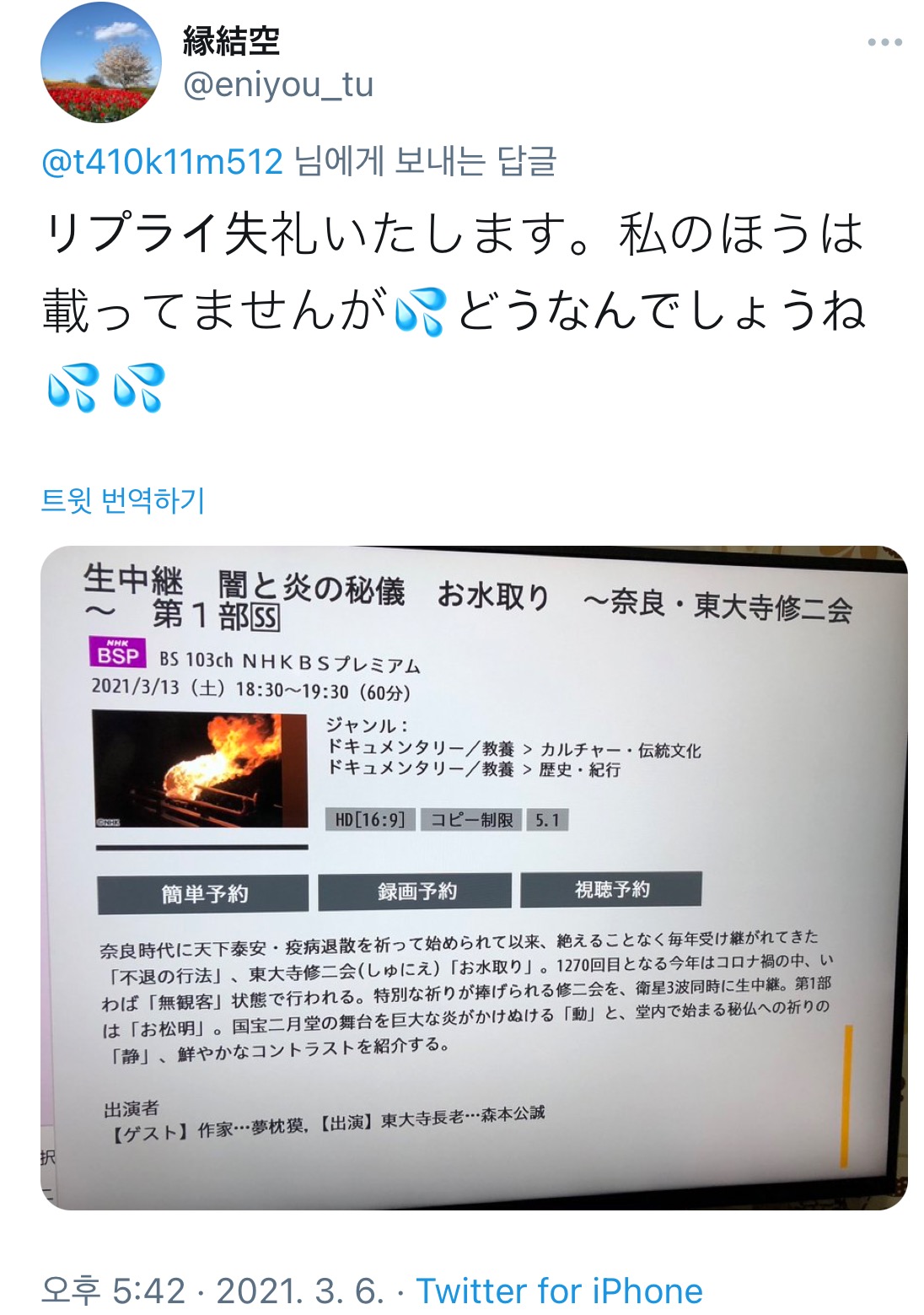 "생중계 오미즈토리 ~나라·도다이지 슈니에"의 게스트가 도모토 쯔요시라고 하는데