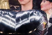 쯔요시상이 오늘 검은 탱크 톱에 흰 T셔츠 그리고 검은 팬츠. 모자, 안경 없음.