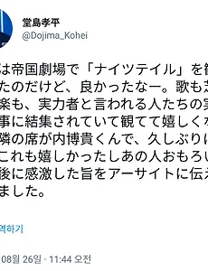 전체 글12455 [도모토 코이치] 나이츠 테일 턴 기술(아크로바틱 리프트) 강좌 ※ 주의점 각도가 얕으면 바로 떨어져 버림 팔꿈치를 조이지 않으면 너무 가까워져버림 가운데가 이상적 각도 OK! 팔꿈치 OK! 훈늉하다! 2018. 8. 26. 8/31~9/2 교토 날씨 (헤이안진구 라이브) 오빠는 정말 대다난것가타...... 2018. 8. 26. [KinKi Kids] 캠프 짱구는 불멸이다. 뭘해도 기엽네 ㅋㅋㅋㅋㅋㅋ 2018. 8. 26. [도모토 코이치] 8/26 도지마 코헤이상 트윗 昨日は帝国劇場で「ナイツテイル」を観劇したのだけど、良かったなー。歌も芝居も音楽も、実力者と言われる人たちの実力が見事に結集されていて観てて嬉しくなった。隣の席が内博貴くんで、久しぶりに会えてこれも嬉しかったしあの人おもろい。終演後に感激した旨をアーサイトに伝えて帰りました。 어제는 제국 극장에서 "나이츠 테일"을 관극했습니다만, 좋았었네. 노래도 연기도 음악도 실력자로 일컬어지는 사람들의 실력이 훌륭히 집결되어 있어 보면서 기뻐졌던. 옆 자리가 우치 히로키군으로 오랜만에 만나서 이것도 기뻤고 저 사람 재밌어. 종연 후에 감격한 사실을 아사이트에게 전하고 돌아왔습니다. 2018. 8. 26. 이전 1 ··· 152 153 154 155 156 157 158 ··· 3114 다음