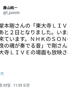 전체 글12455 [KinKi Kids] 10/29 포토북 2018 발매 2018. 10. 4. [도모토 쯔요시] 10/8 돈나몬야 담당 10/8(月)は剛くんが登場!鬼の話、ホットケーキの話、でほぼ時間切れとなります笑 10/8(월)는 쯔요시군이 등장! 귀신 이야기, 핫 케이크의 이야기로 거의 시간이 만료됩니다.ㅎㅎ 홋토케키 붐 마다까요! ㅎㅎ 2018. 10. 4. [도모토 쯔요시] 10/2 & 10/3 나라일일신문 후쿠야마 유이치상 트윗 5日の堂本剛さんの「東大寺LIVE」掲載まであと2日となりました。いま最終校正まで来ています。NHKのSONGSでも「奈良の魂が奏でる音」で剛さんが出演、東大寺LIVEの場面も放映されました。 5일의 도모토 쯔요시씨의 "동대사 LIVE" 게재까지 앞으로 2일이 되었습니다. 지금 최종 교정까지 와있습니다. NHK의 SONGS에서도 "나라의 영혼이 연주하는 소리"에서 쯔요시상이 출연, 동대사 LIVE의 장면도 방영되었습니다. 5日付の堂本剛さんの「東大寺LIVE」の新聞最終ゲラを今読んでいます。大仏様の前でリフトが上昇し演奏する剛さん。修行僧のようです。奈良愛に満ちたトークが胸を熱くします。 5일자의 도모토 쯔요시상의 "동대사 LIVE"의 신문 최종 교정쇄를 지금 읽고 있습니다. 대불앞에서 리프트가 상승해 연주하는 쯔요시상. 수도승 같습니다. .. 2018. 10. 3. [도모토 쯔요시] 10/3 코기리 당락 발표 18:00 경 2018. 10. 3. 이전 1 ··· 92 93 94 95 96 97 98 ··· 3114 다음
