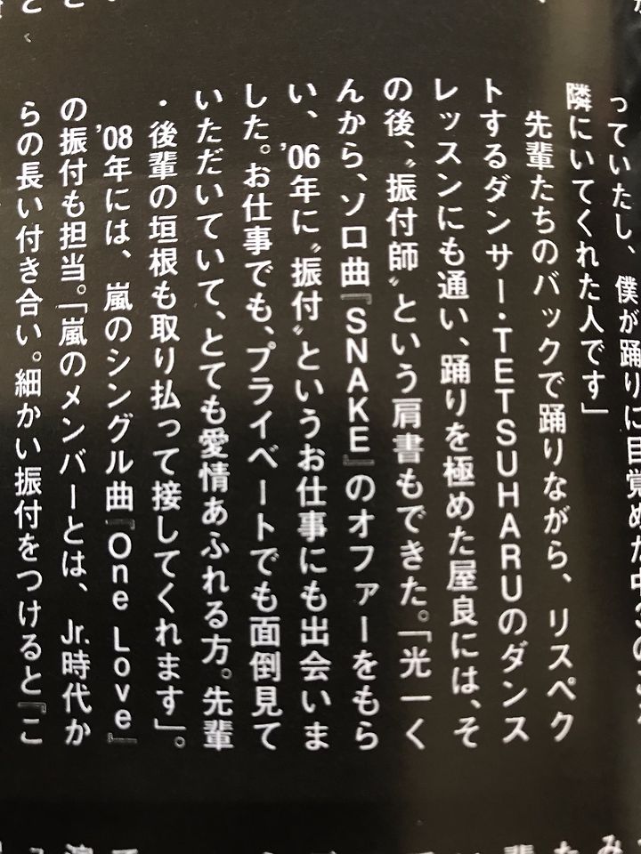 "코이치군으로부터 솔로곡 SNAKE의 오퍼를 받아 '06년에 "안무"라고 하는 일과도 만났습니다. 일로도 프라이베잇으로도 돌봐주고 계셔서 매우 애정이 흘러넘치는 분. 선배, 후배의 울타리도 걷어내고 접해주십니다"