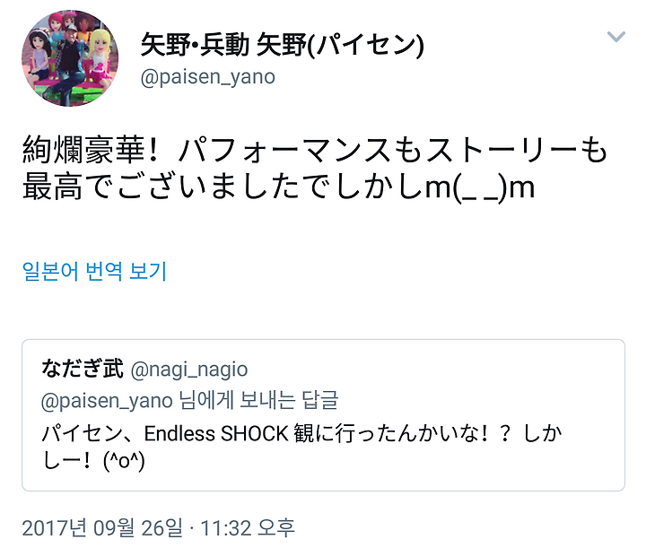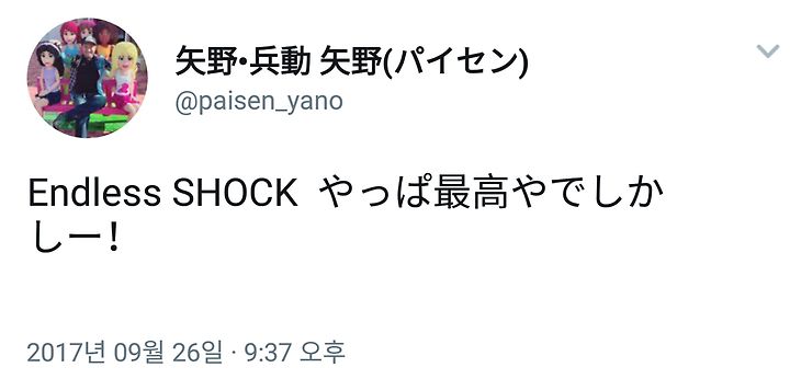 [도모토 코이치] 9/26 야노 카츠야상 트윗 (SHOCK 관극)