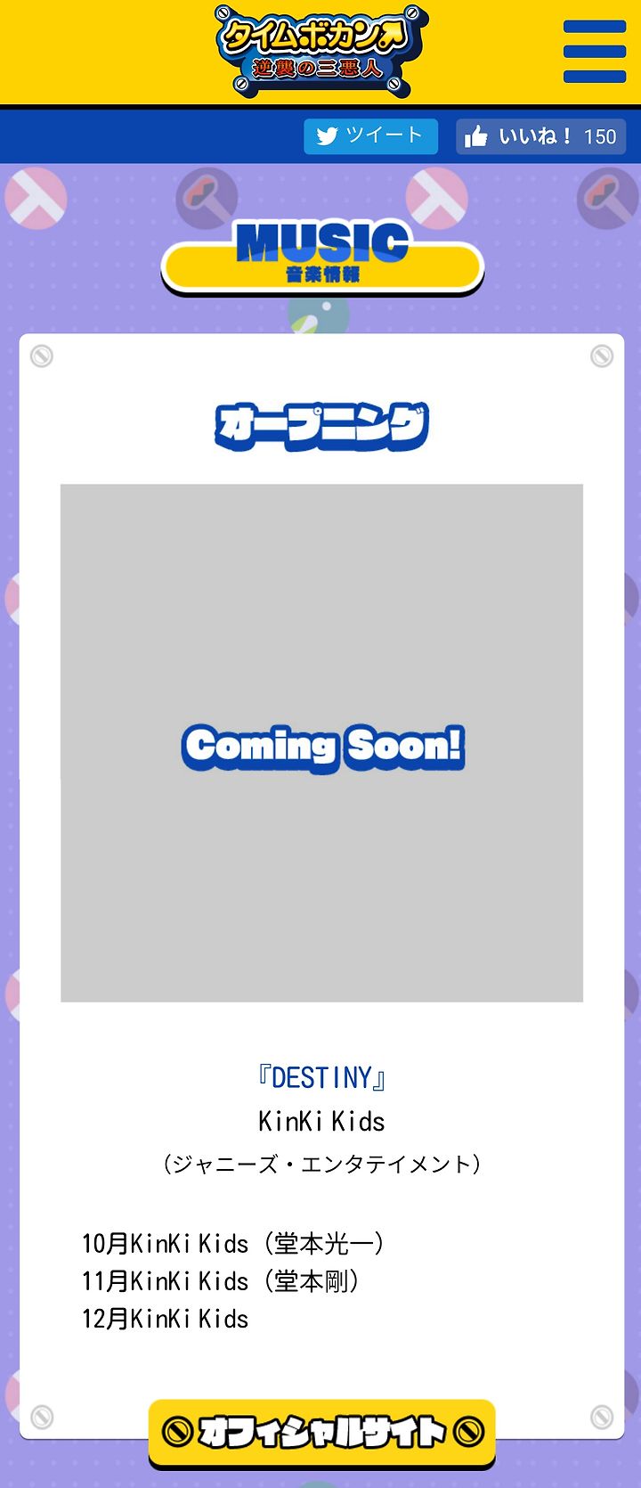 KinKi Kids의 신곡"DESTINY"가 10월 7일(토)부터 요미우리 텔레비전·일본 테레비 계열에서 방송되는 새 애니메이션 "타이무보칸 역습의 세 악인"의 오프닝 주제로 결정되었다.
