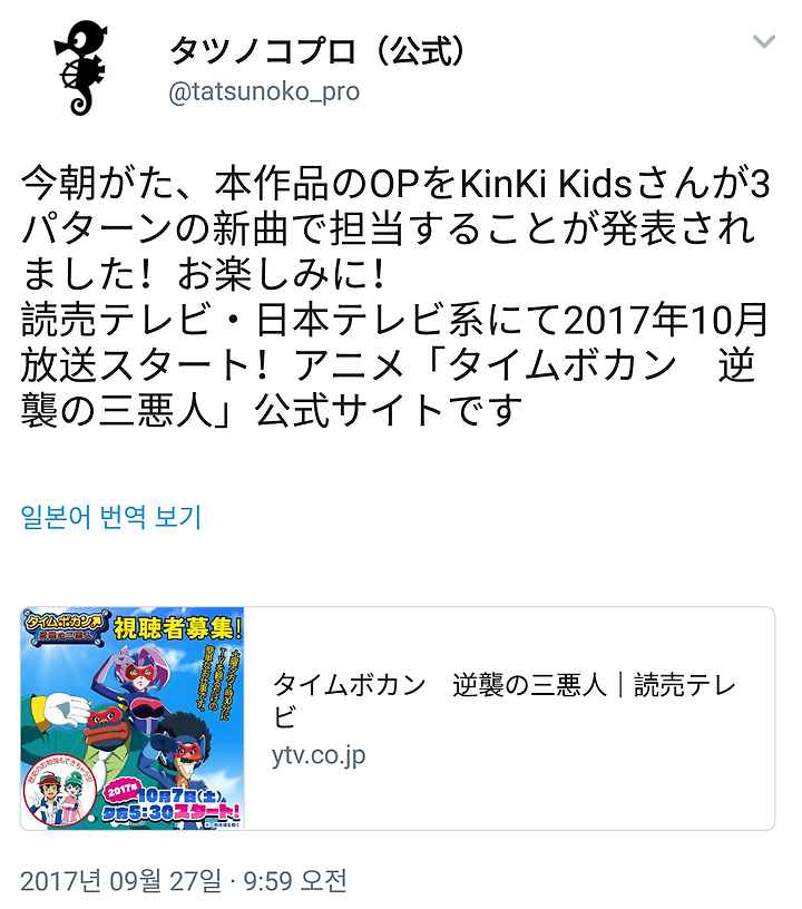 10월 7일(토)부터 일본 테레비 계열에서 시작되는 애니메이션 "타이무 보칸 역습의 세 악인"(매주 토요일 낮 5:30-밤 6:00). 동방송 오프닝 테마를 KinKi Kids가 담당한 것으로 드러났다.