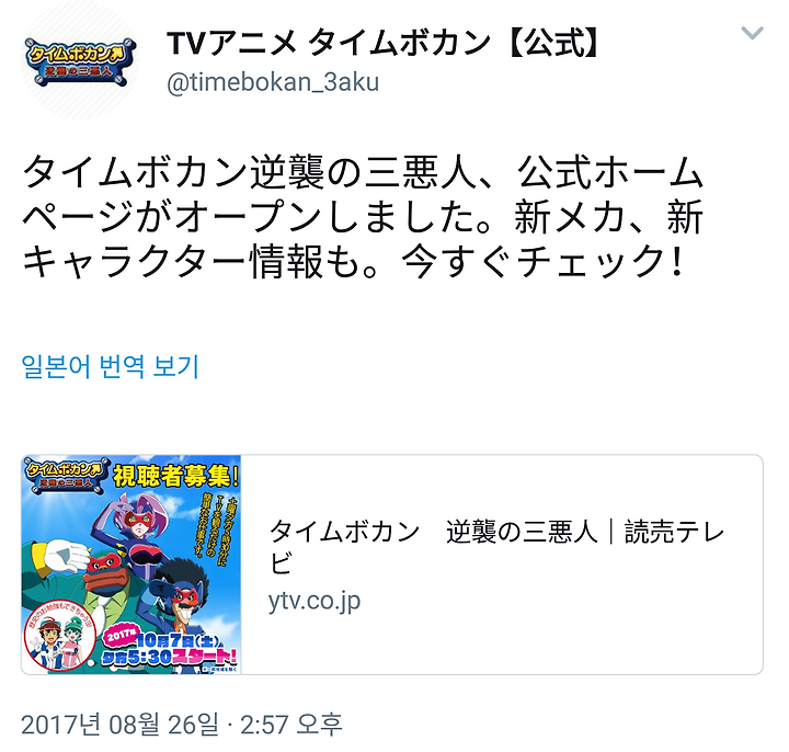 "타이무 보칸 역습의 세 악인"은 40년 이상 지속되는 국민적 인기 애니메이션 "타이무 보칸" 시리즈의 최신작. 2016년 10월~2017년 3월에 방송된 "타이무 보칸24"의 일부 설정을 변경하여 버전업한 새로운 시리즈이다.