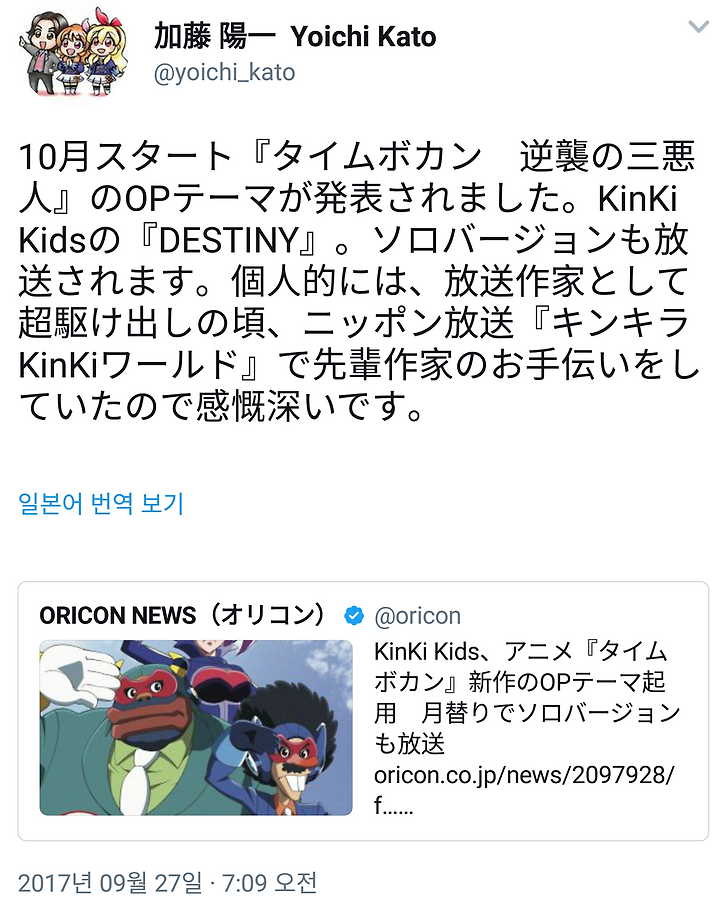 10월 스타트 『타이무보칸 역습의 세 악인』의 OP 테마가 발표되었습니다. KinKi Kids의 『DESTINY』. 솔로 버전도 방송됩니다. 개인적으로 방송 작가로서 완전 신출내기 시절 일본 방송 『킨키라 KinKi월드』에서 선배 작가를 돕고 있었기 때문에 감개무량합니다.