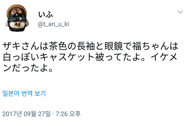 마츠자키상은 갈색 긴소매와 안경이고 후쿠짱은 흰색 캐스캣 쓰고 있었어. 미남이었어