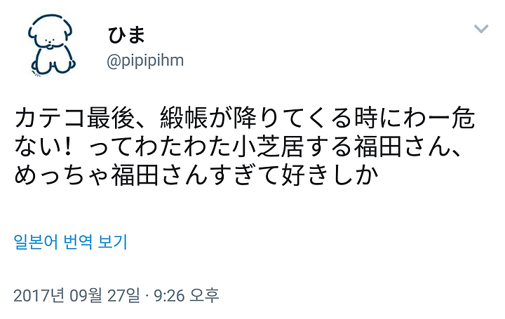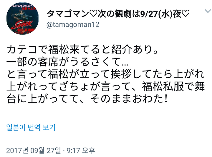커튼콜 마지막, 무대막이 내려올 때에..."와- 위험해!!!" 라며 파닥거리며 소연기를 하는 후쿠다상. 엄청 너무 후쿠다상이어서 좋아할 수 밖에