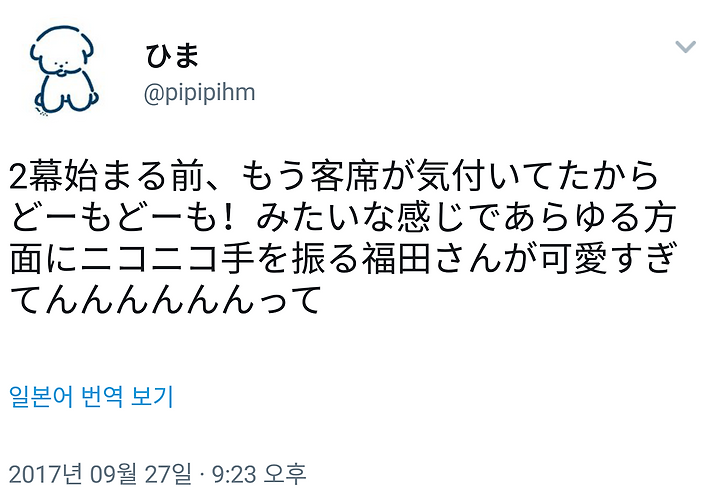 2막 시작 전, 이미 객석이 알고 있기 때문에 "도모~ 도모~" 같은 느낌으로 온갖 방면에 방긋방긋 손을 흔드는 후쿠다상이 너무 귀여워서어어어어어어