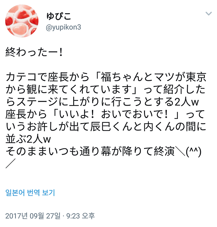 커튼콜에서 좌장으로부터 "후쿠짱과 마츠가 도쿄에서 보러 와주었습니다" 라고 소개했더니 스테이지에 올라가러 가려고 하는 두 사람 ㅎㅎ