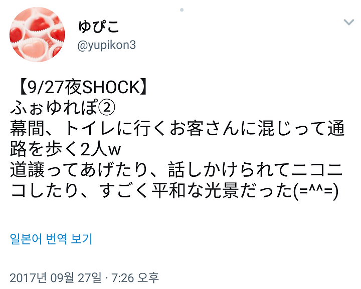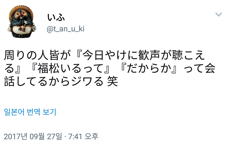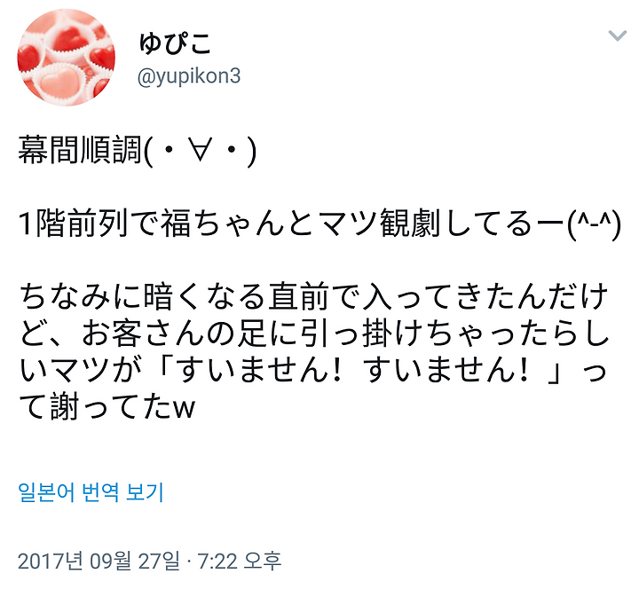 주위 사람 모두가 "오늘 왠지 더 환호성이 들리네" "후쿠 마츠가 있대" "그래서인건가" 라며 대화하는 게 웃겼다 ㅎㅎ