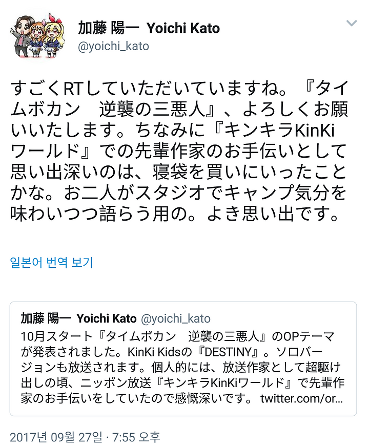 [KinKi Kids] 9/27 「タイムボカン(타이무보칸)」 각본가 加藤 陽一(요이치 카토)상 트윗