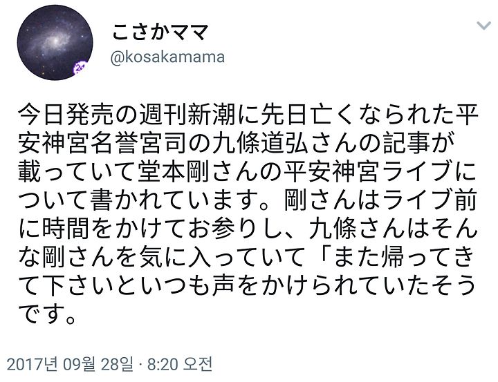 오늘 발매된 주간 신초에 얼마 전 돌아가신 헤이안 신궁 명예 사제장인 쿠죠 미치히로상 기사가 실려 있어 도모토 쯔요시상의 헤이안 신궁 라이브에 대해서 쓰여지고 있습니다. 쯔요시상은 라이브 전에 시간을 들여 참배하고, 쿠죠상은 그런 쯔요시상이 마음에 들어 "또 돌아와주세요" 라고 언제나 말을 걸으셨었다고 합니다.
