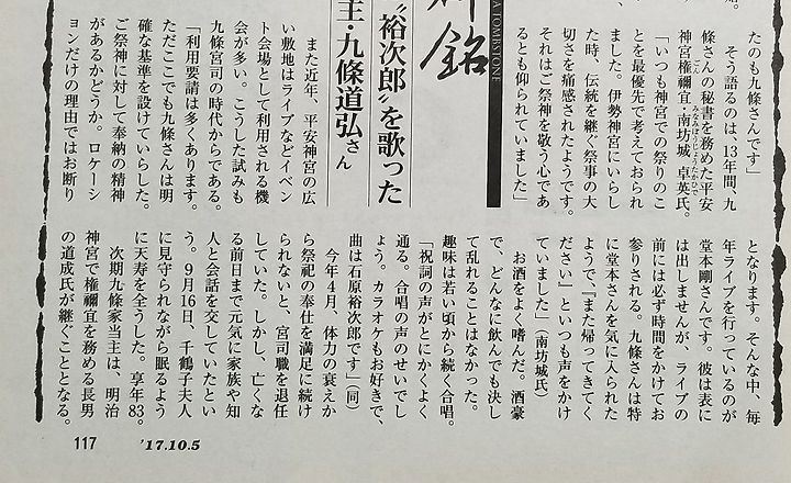 오늘 발매의 "주간 신조" 10/5호의 칼럼 『묘비명』에 얼마 전 돌아가신 헤이안 신궁 쿠죠 미치히로 전 사제장의 이야기가 게재되어 있어, 도모토 쯔요시상의 헤이안 신궁 라이브에 대해서도 쓰여있다고 합니다.