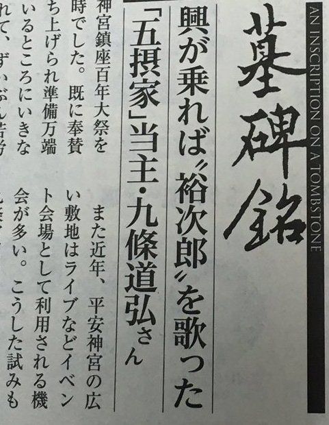 오늘 발매 『주간 신조』 (묘비명)에 얼마 전 돌아가신 헤이안 신궁 전 사세장 쿠죠 미치히로상의 기사가 게재되어 있고, 도모토 쯔요시상의 헤이안 신궁 라이브에 대해서 쿠죠상의 비서를 하셨던 미나미보우죠상이 이야기를 하고 계십니다.