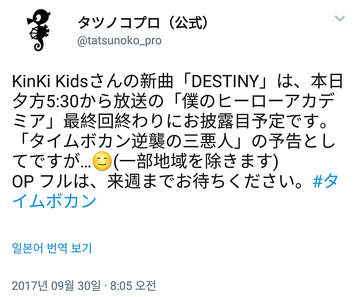 KinKi Kidsさんの新曲「DESTINY」は、本日夕方5:30から放送の「僕のヒーローアカデミア」最終回終わりにお披露目予定です。「タイムボカン逆襲の三悪人」の予告としてですが…(一部地域を除きます)