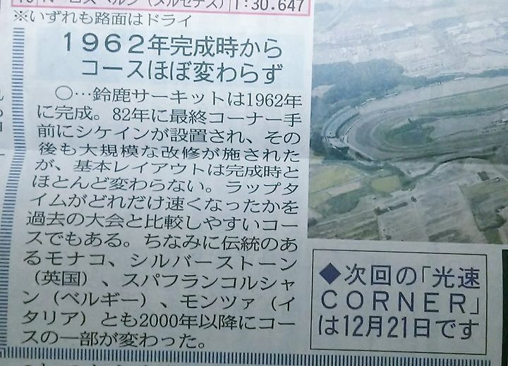 스즈카 서킷은 1962년에 완성. 82년에 최종 코너 직전에 시케인(chicane 감속용 장애물)이 설치되고 그 후도 대규모 개수가 실시되었지만 기본 레이아웃은 완성 때와 거의 변함이 없다. 랩타임이 얼마큼 빠르게 되었는지를 과거 대회와 비교하기 쉬운 코너이기도 하다. 참고로 전통이 있는 모나코, 실버스톤(영국) 스파프랑코샹(벨기에) 몬짜(이탈리아) 모두 2000년 이후에 코스 일부를 변경했다.