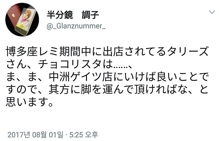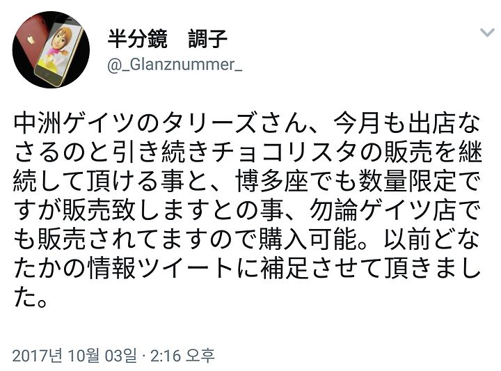 나카스 게이츠의 툴리스상. 이번 달도 하카타자 내에 출점한다는 것과, 이어서 쵸코리스타의 판매를 계속하신다는 것과, 하카타자에서도 수량 한정이지만 판매한다는 것. 물론 게이츠점에서도 판매되고 있으므로 구입 가능. 이전에 어떤 분이 정보 트윗 한 것에 보충하였습니다.
