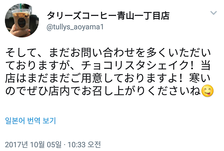 그리고 아직 문의를 많이 받고 있습니다만 쵸코리스타 쉐이크! 당점은 아직 준비해두고 있습니다! 춥기 때문에 꼭 가게 안에서 드세요.