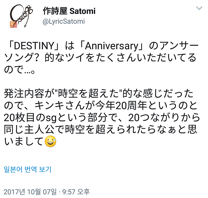 "DESTINY"는 "Anniversary"의 앤서송? 적이라는 트윗을 많이 받고 있기 때문에...