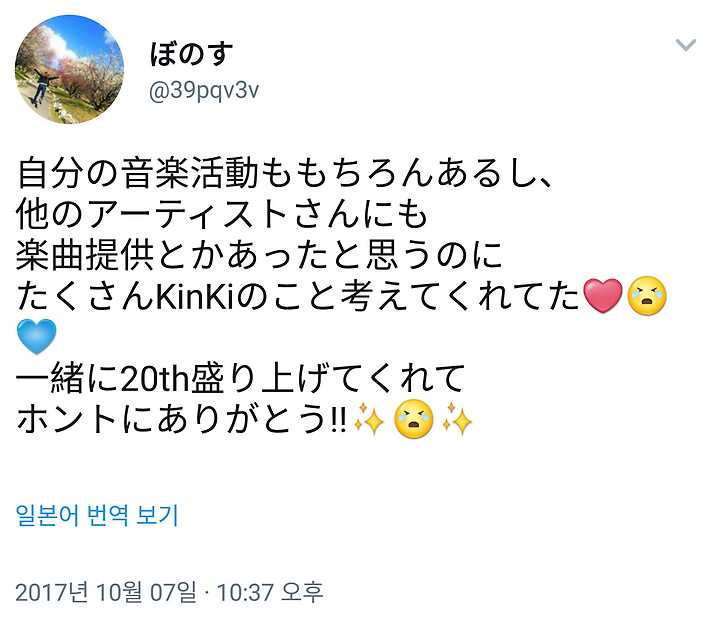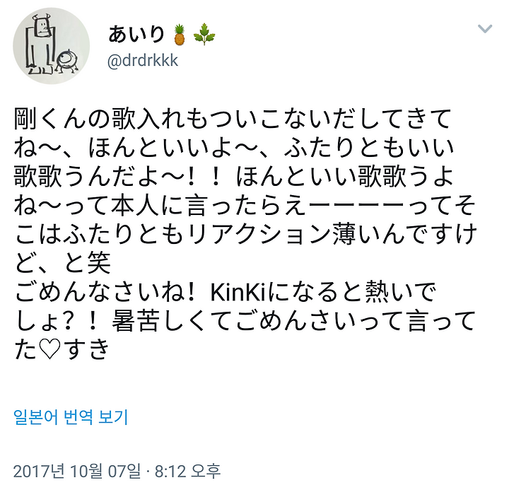쯔요시군의 노래 녹음도 바로 얼마 전 하고 와서 말야~ 정말 좋아~ 둘다 좋은 노래 부른다구~ 정말로 좋은 노래 부르네~~ 라고 본인데게 말했더이 "에................." 라고 그 부분은 둘 다 리액션이 약한데 말이지.... 라고 ㅎㅎ 미안해요 킨키 얘기가 되면 뜨겁죠? 무더워서 미안해요 라고 말했다 ♡ 좋아