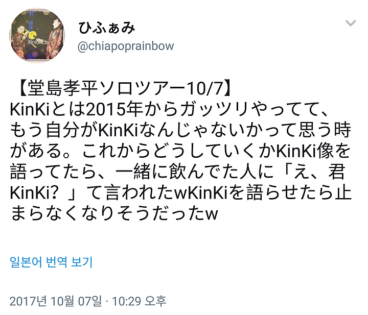 KinKiとは2015年からガッツリやってて、もう自分がKinKiなんじゃないかって思う時がある。これからどうしていくかKinKi像を語ってたら、一緒に飲んでた人に「え、君KinKi?」て言われたwKinKiを語らせたら止まらなくなりそうだったw