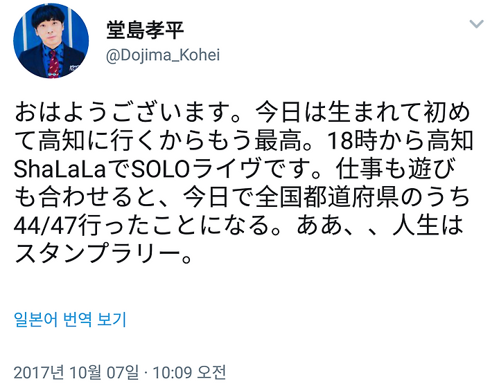 좋은 아침입니다. 오늘은 태어나서 처음으로 고치에 가기 때문에 정말 최고. 18시부터 고치 ShaLaLa에서 솔로 라이브입니다. 일도 놀이도 합치면 오늘로 전국 도도부현 중 44/47 간 것이 되는. 아아... 인생은 스탬프 랠리.