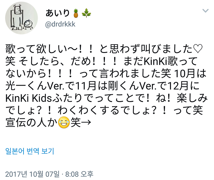 불렀으면 좋겠어!! 라고 무심코 외쳤습니다♡ 그랬더니 "안돼! 아직 KinKi 노래하지 않으니까!!" 라고 들었어요ㅎㅎ 10월은 코이치군 Ver. 11월은 쯔요시군 Ver. 12월에 KinKi Kids 두 사람으로.. 라는 것으로! 그쵸! 기대되죠? 두근두근 하죠?! 라고 ㅎㅎ