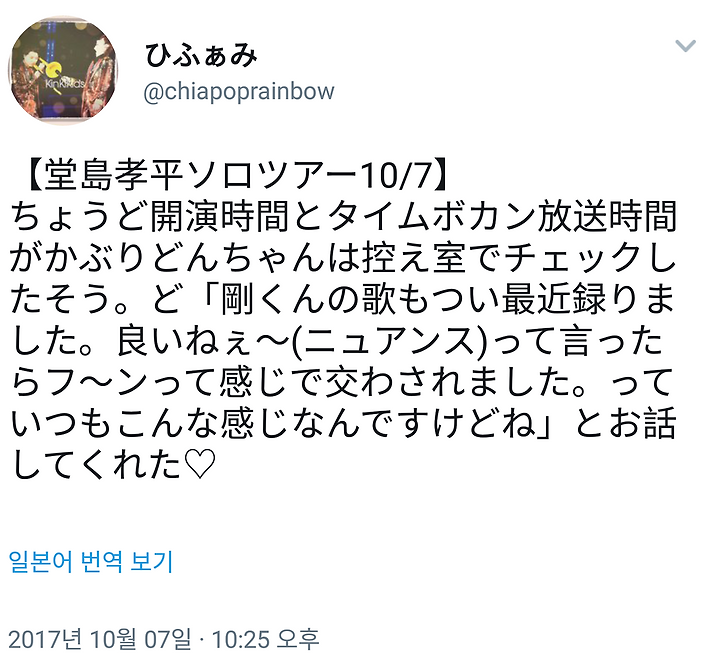 ちょうど開演時間とタイムボカン放送時間がかぶりどんちゃんは控え室でチェックしたそう。ど「剛くんの歌もつい最近録りました。良いねぇ〜(ニュアンス)って言ったらフ〜ンって感じで交わされました。っていつもこんな感じなんですけどね」とお話してくれた♡