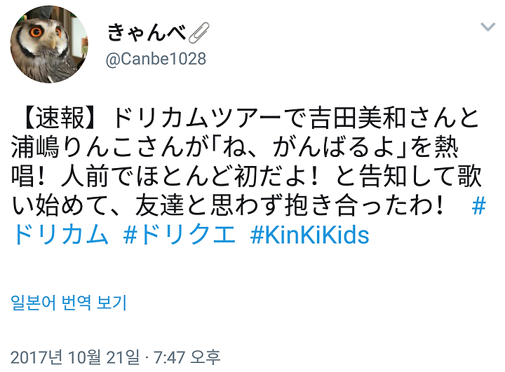 アンコールで、『ね、がんばるよ。』やってくれた!!正人さんが「marry meって曲のアンサーソングで、KinKi Kidsのおふたりが書いてくださいって提供した曲です。本家のおふたりの曲もぜひ聞いてください」って言ってくれた(;▽;) #ドリカム #KinKiKids