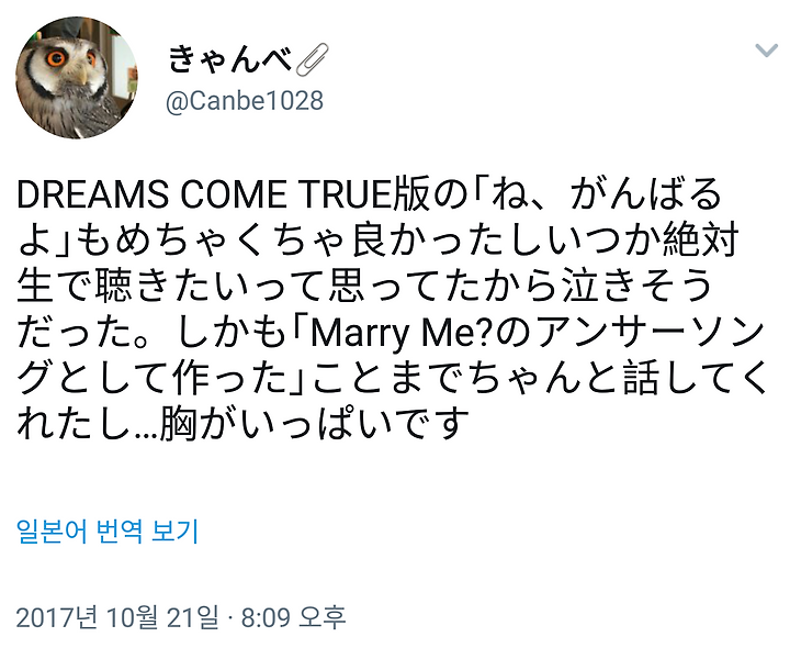 DREAMS COME TRUE판의 "네, 감바루요"도 엄청 좋았고, 언젠가 꼭생으로 듣고 싶다고 생각했기 때문에 울뻔 했다. 게다가 "Marry Me?"의 앤서송으로서 만들었다"라는 것까지 정확히 말해 주고… 가슴이 벅찼습니다.