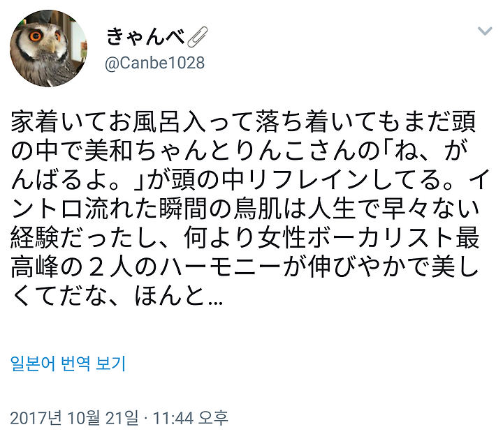 집에 도착해서 욕조에 들어가 마음을 가라앉혀도 아직 머릿속에서 미와짱과 링코상의 "네, 감바루요"가 머리 속 리프레인하고 있다. 인트로 흘러나왔던 순간의 닭살은 인생에서 좀처럼 없는 경험이었고 무엇보다 여성 보컬리스트 최고봉들의 하모니가 평온하고 아름다워서 정말로....