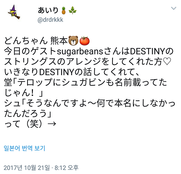 오늘 게스트 sugarbeans상은 DESTINY의 스트링스의 어레인지를 해주신 분♡ 갑자기 DESTINY의 이야기를 해주었다.