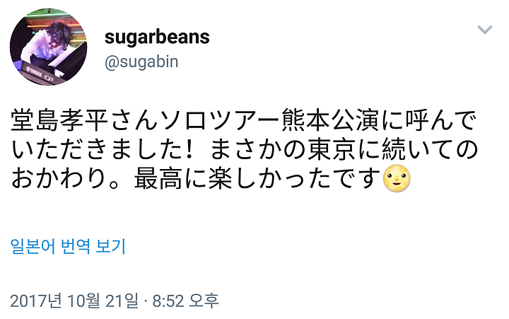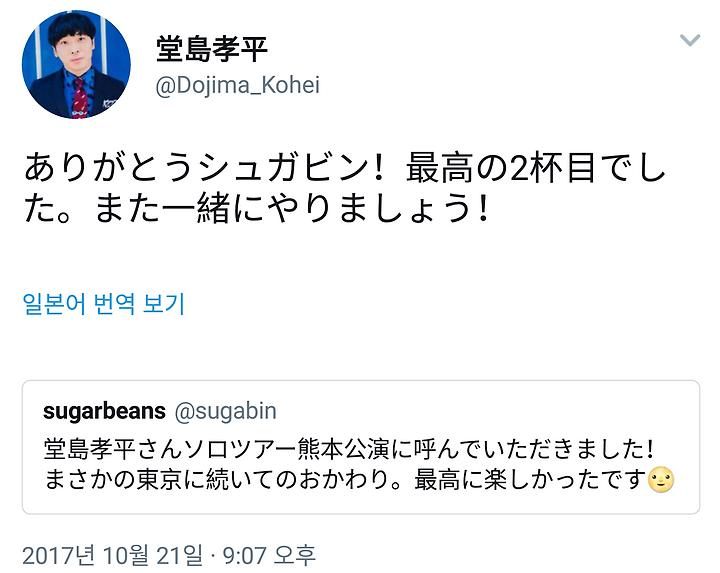 도지마 코헤이상 솔로 투어 쿠마모토 공연에 불러주셨습니다! 설마했던 도쿄에 이어 오카와리(한 잔 더). 최고로 즐거웠습니다.