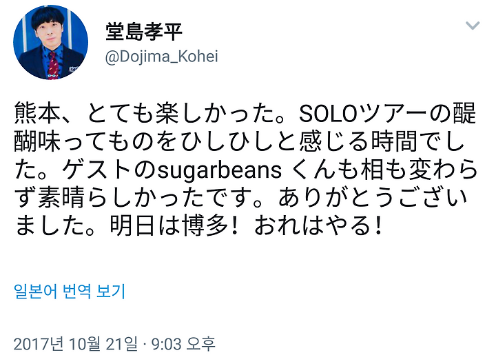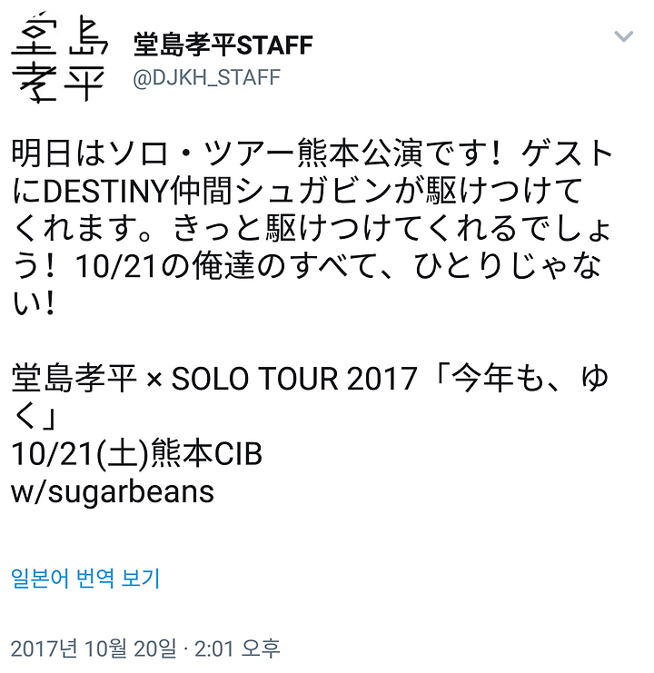 내일은 솔로 투어 쿠마모토 공연입니다! 게스트로 DESTINY 동료 슈가빈이 달려와 주겠습니다. 분명 "달려와" 주겠죠! (입장할 때 진짜 달려서 들어옴) 10/21 우리들 모든 것, 히토리쟈나이!