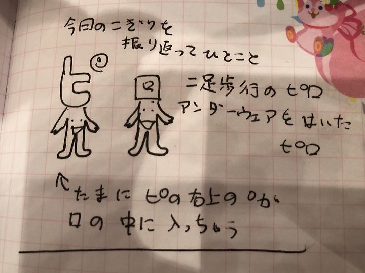어쨌든 그 분 왈, 이 "피로" 라는 단어는 그냥 생각나서 적은 거라고 ㅋㅋㅋㅋ 아무 의미 없는 말이라고 함 ㅋㅋㅋㅋㅋㅋㅋㅋㅋㅋㅋ 쯔요시 자기라면 절대 이런 말 못쓸거라고. 쓴다하더라도 분명 이걸 답으로 쓰면 그게 무슨 뜻이냐고 물어볼게 분명하니 이런저런 설명까지 생각해야하고 그러면 결국 못쓸거라고. 그런데 그런거 아무 상관없이 그냥 생각난대로 그대로 적었다는 그 자체가 매우 훈늉하다며 감동의 물결 ㅋㅋㅋ 그 후에도 몇 번이나 "피로" 가 여기 저기서 툭하면 불쑥불쑥 튀어나오다(다른 문제에 외국어 문장 듣고 통역하는 문제에도 답으로 피로를 써먹으심ㅋㅋㅋ 진짜 타이밍 절묘했던ㅋㅋ) 동사화까지 되어 "피롯테루(피로하고 있다)" 같이 단어 응용을 구사하시고 오늘의 코기리를 한 마디로 한다면? 이라는 마지막 문제에 "피로" 를 이렇게 일러스트화 해서 오늘 하루를 마무리 지으심 ㅎㅎㅎ (카와하라상이 ピ의 저 동그라미는 어떻게 된거냐며 물었더니 얘가 막 움직이는데 그러다가 ロ쪽으로 붙기도 했다가 또 이쪽으로 가기도 했다가 라며 웅얼웅얼웅얼ㅎㅎ)