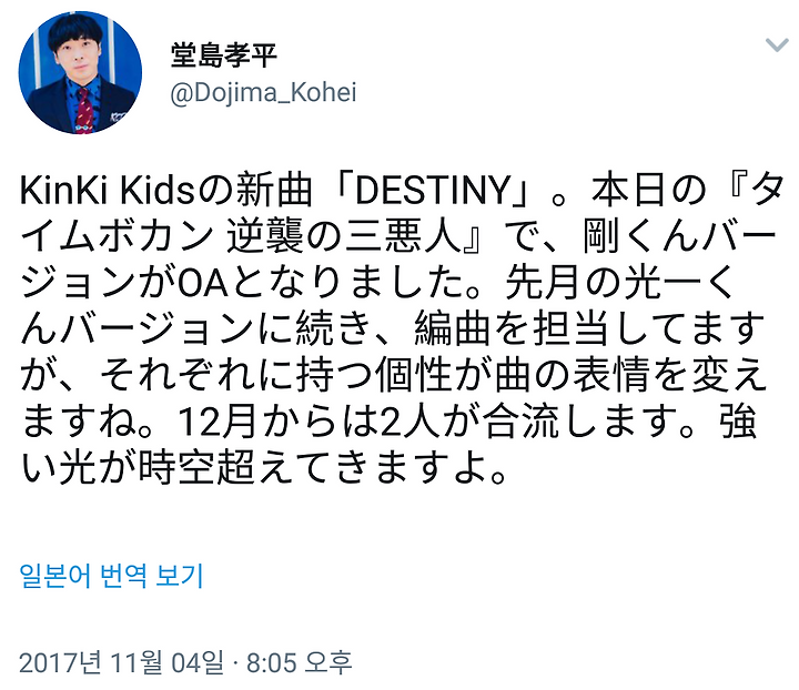 KinKi Kids의 신곡 "DESTINY". 오늘 『타이무보칸 역습의 세악인』에서 쯔요시군 버전이 OA 되었습니다. 지난 달의 코이치군 버전에 이어 편곡을 담당하였습니다만 각각이 가진 개성이 곡의 표정을 바꾸네요. 12월부터는 두 사람이 합류합니다. 강한 빛이 시공을 뛰어넘어올거에요.