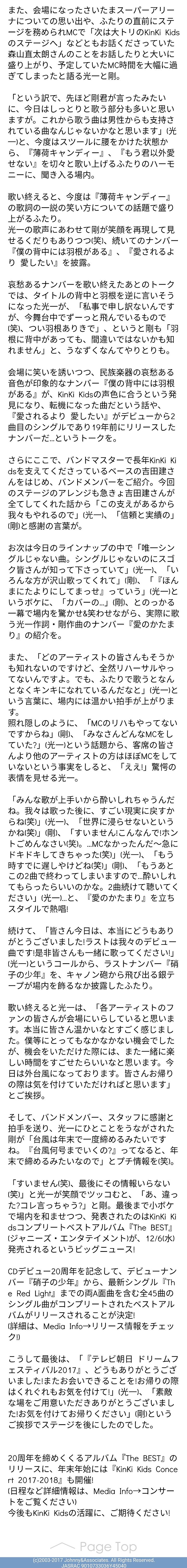 회장에 웃음을 유도하며 민족 악기의 애수있는 음색이 인상적인 넘버 「ボクの背中には羽根がある」가 KinKi Kids의 목소리 색에 맞는다는 발견이 되어 전기가 된 곡이라는 이야기나, 「愛されるより愛したい」가 데뷔로부터 2번째 싱글이며 19년 전에 릴리즈했던 넘버라고 하는 토크를.