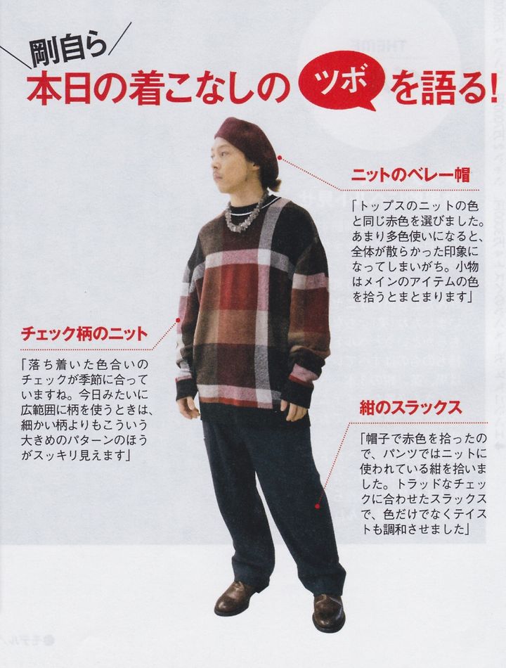 전통적인 체크에 맞춘 슬랙스로 색뿐만이 아니라 테이스트도 조화시켰습니다.