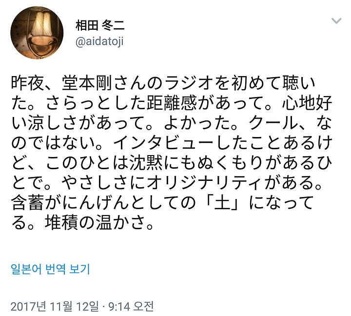 어젯 밤에 도모토 쯔요시상의 라디오를 처음 들었다. 산뜻한 거리감이 있고. 기분좋은 상쾌함이 있고. 좋았다. 쿨, 한 것은 아니다. 인터뷰한 적이 있지만 이 사람은 침묵에도 온기가 있는 사람으로. 상냥함에 오리지널리티가 있다. 함축이 인간으로서의 "흙"이 되어있다. 퇴적의 따뜻함.