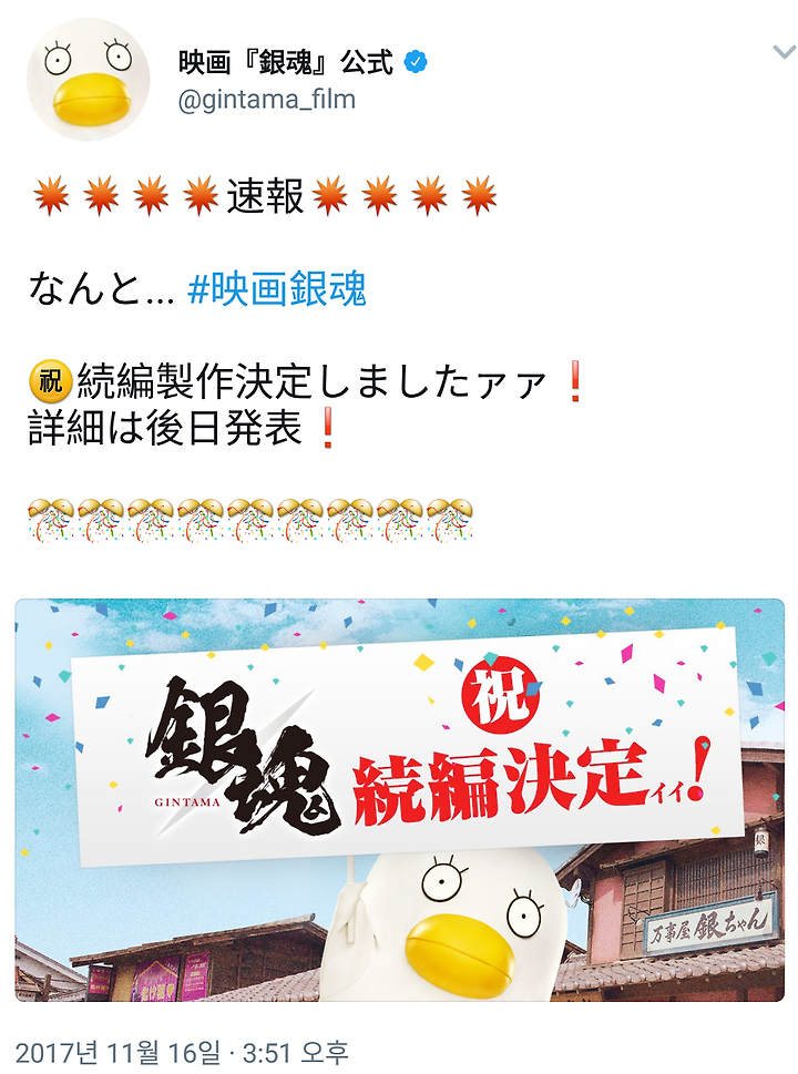 소라치 히데아키씨의 인기 만화를 오구리 슌 주연, 후쿠다 유이치 감독으로 실사화하여 2017년 공개로 히트한 영화 『은혼』이 속편 "은혼 파트 2(가제)"를 제작하는 것이 16일 알려졌다. 도내에서 열린 행사에서 오구리와 후쿠다 감독으로부터 발표되었다. 속편은 2018년 여름에 공개.