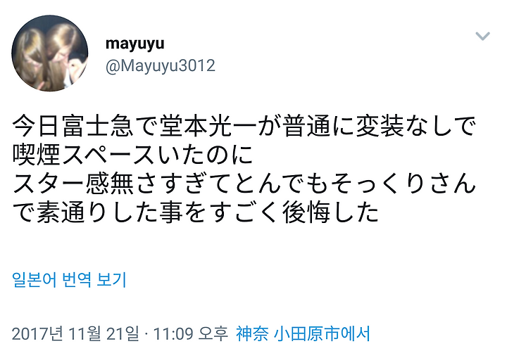 오늘 후지큐에서 도모토 코이치가 아무렇지도 않개 변장도 안하고 흡연실에 있었는데 스타감이 너무 없어서 말도 안되게 닮았네 라며 그냥 지나친 걸 매우 후회했다