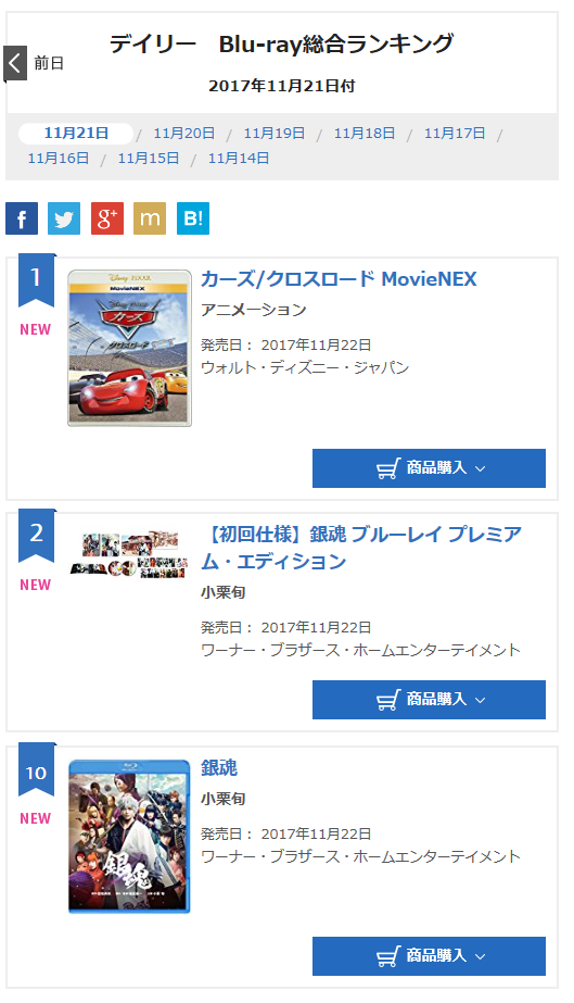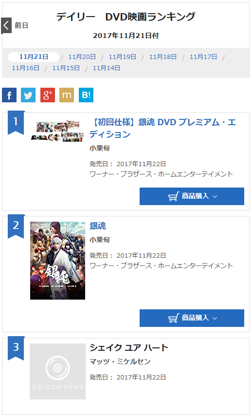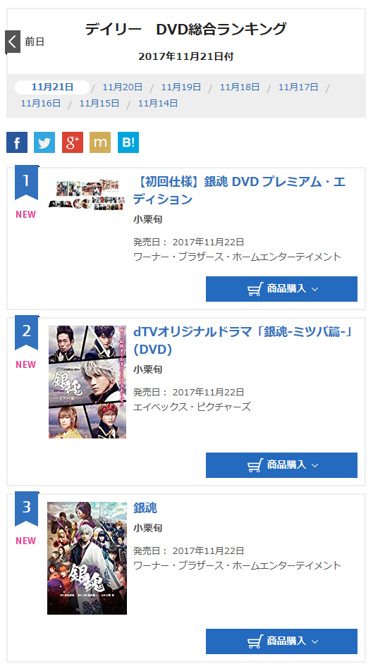 [도모토 쯔요시] 11/21 은혼 DVD/Blu-ray 오리콘 데일리 랭킹