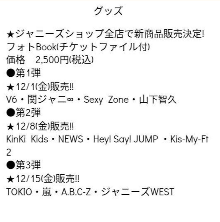 KinKi Kids [KinKi Kids] 12/8 쟈니즈샵 포토북 판매 자오딩 2017. 11. 25. 14:05 쟈니즈샵 전점 신상품 발매 결정포토북 (티켓파일 첨부)가격 2500엔