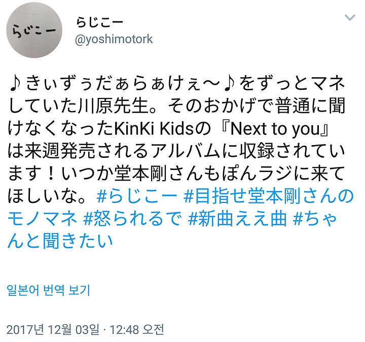 ♪키이즈으다라아케에~ 상처투성이~ 를 계속 흉내내고 있던 카와하라 선생. 그 덕분에 평범히 들을 수 없게 된 KinKi Kids의 『Next to you』는 다음주 발매되는 앨범에 수록되어있습니다! 언젠간 도모토 쯔요시상도 폰라지에 와주었으면 좋겠네. # 라지코 # 노려라 도모토 쯔요시상 모노마네 # 혼난다구 # 신곡 좋은 곡 # 제대로 듣고 싶어